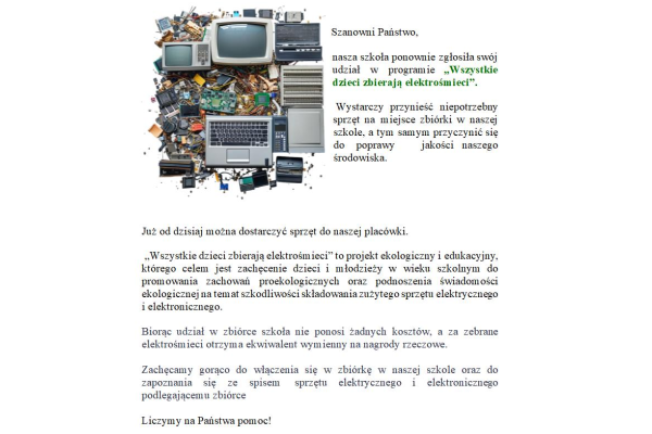 Szanowni Państwo, nasza szkoła ponownie zgłosiła swój udział w programie „Wszystkie dzieci zbierają elektrośmieci”...