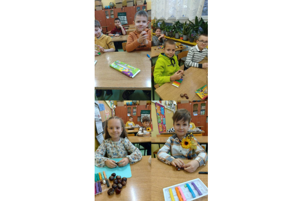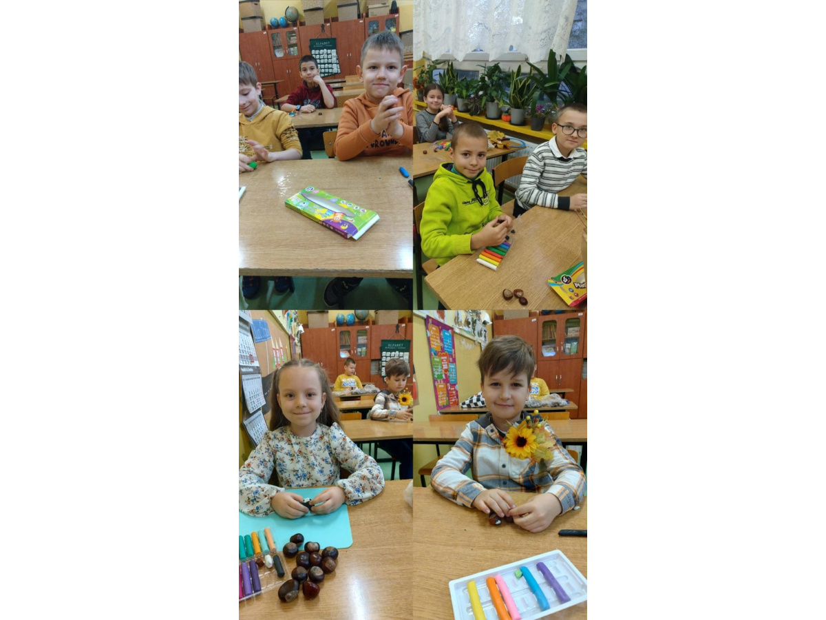 Dodatkową atrakcją było tworzenie ciekawych prac z kasztanów i plasteliny – dzieci wykazały się ogromną kreatywnością, tworząc różnorodne postacie i jesienne kompozycje.