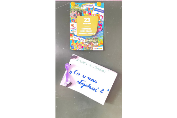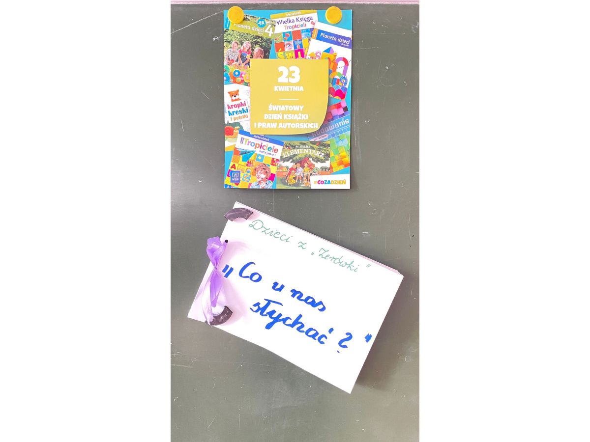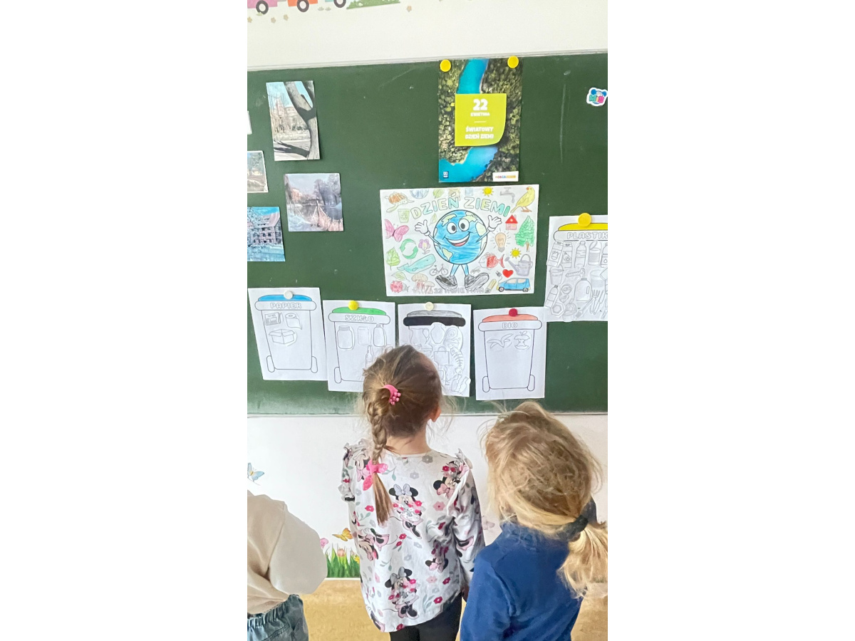 Dzieci z oddziału przedszkolnego 22 kwietnia obchodziły Dzień Ziemi. Rozmawialiśmy o segregacji, recyklingu. Dzieci sprawdzały swoją wiedzę w praktyce - gdzie wyrzucić odpad, sprzątaliśmy teren wokół szkoły i na placu zabaw. Natomiast 23 kwietnia świętowaliśmy Dzień Książki. Rozmawialiśmy o budowie książki, o swoich ulubionych książkach. Dzieci tworzyły własną książeczkę o swojej grupie.