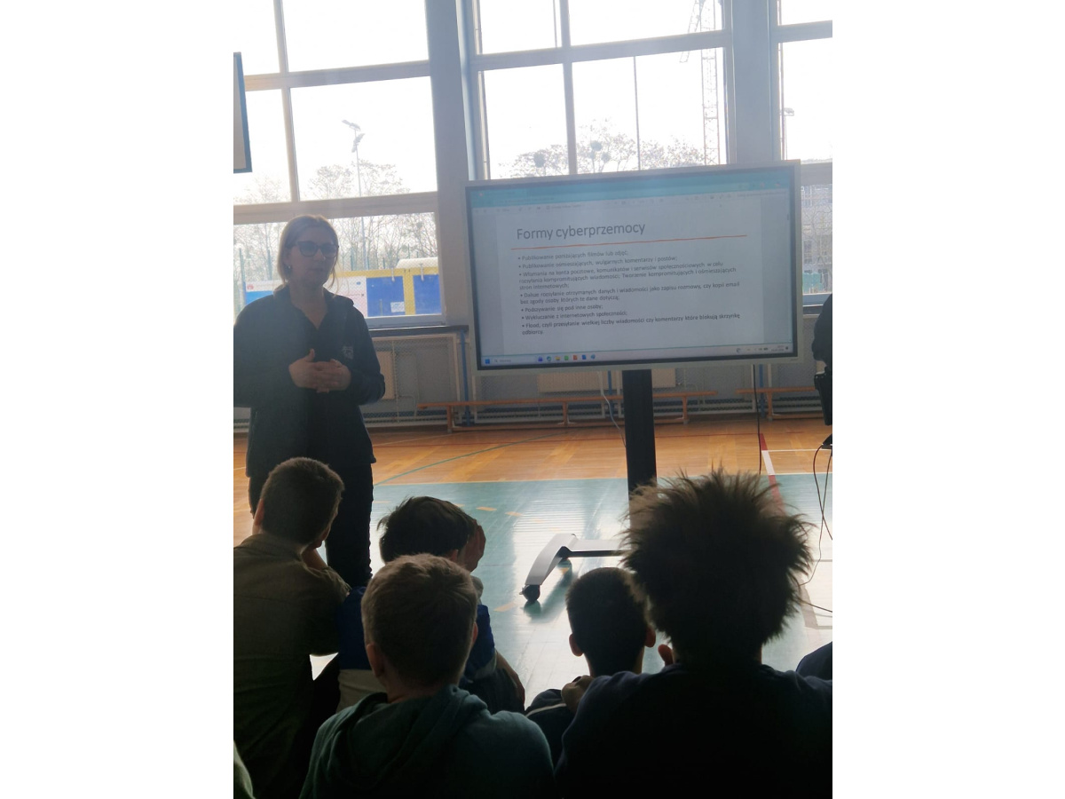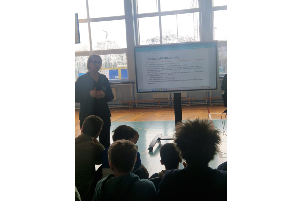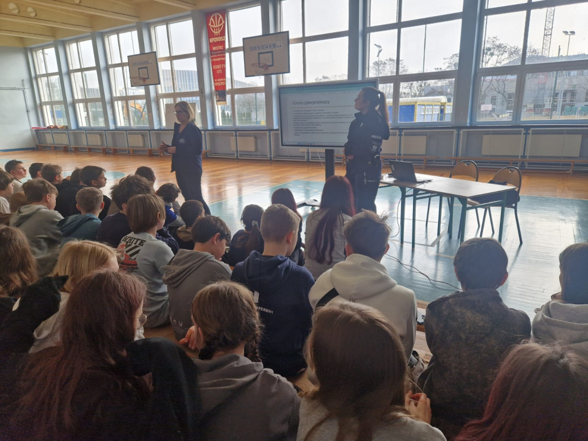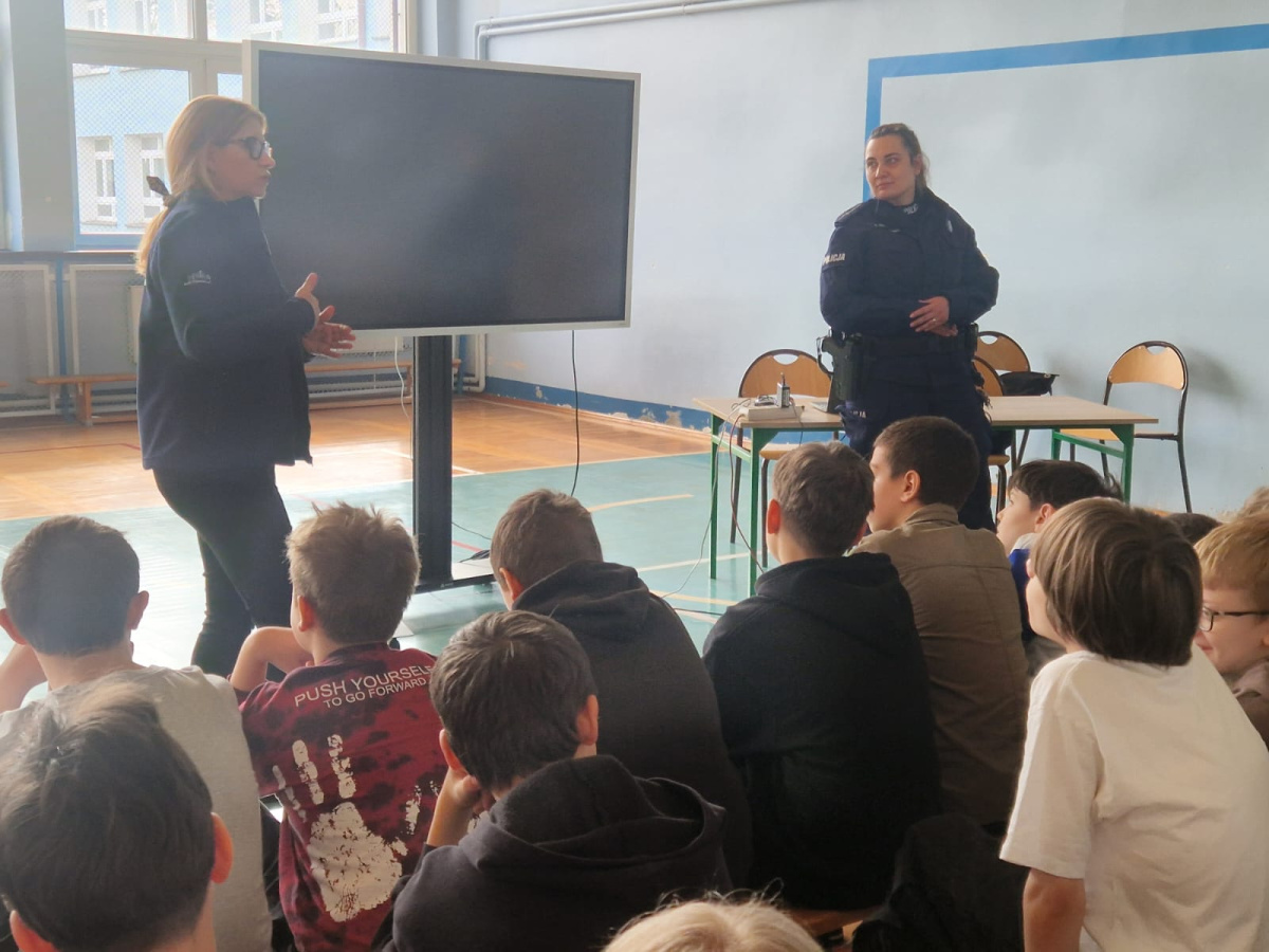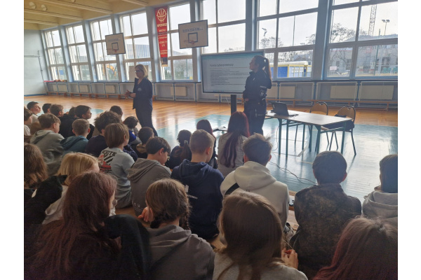 Spotkanie miało charakter interaktywny – uczniowie chętnie zadawali pytania i dzielili się swoimi spostrzeżeniami. Dzięki temu była to nie tylko cenna lekcja profilaktyki, ale także okazja do refleksji nad własnym bezpieczeństwem i odpowiedzialnością za swoje działania zarówno w świecie realnym, jak i wirtualnym.