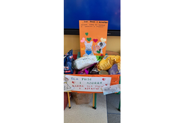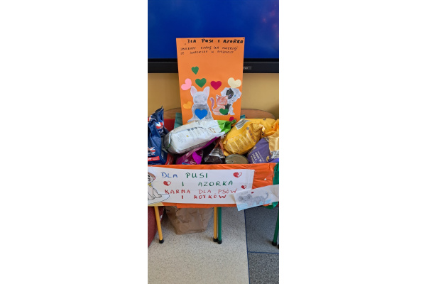 W naszej szkole odbyła się akcja charytatywna pod hasłem „Pomóż Pusi i Azorkowi”, której celem było wsparcie zwierząt ze schroniska poprzez zbiórkę karmy dla psów i kotów.