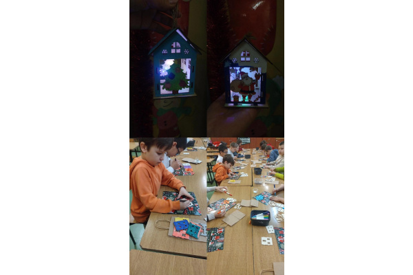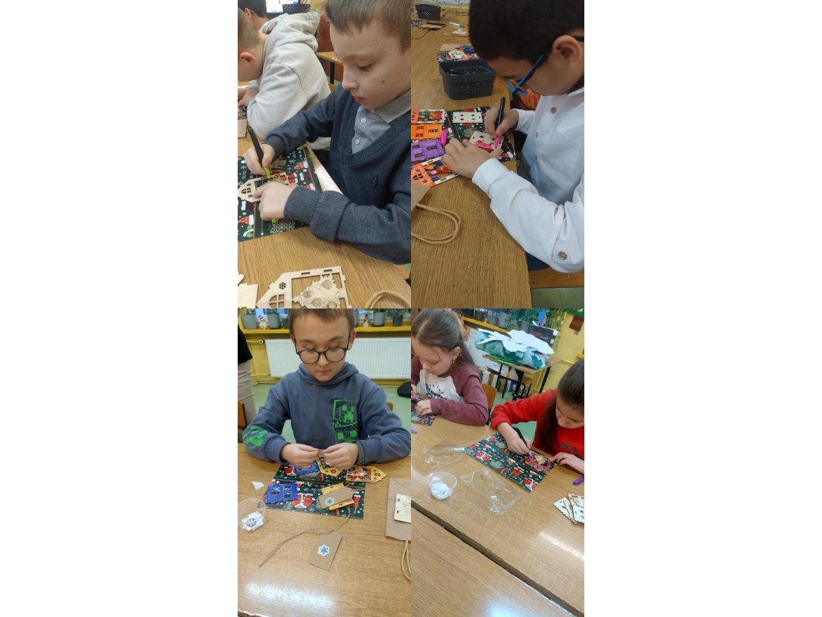 W środę, 10 grudnia 2025 roku, w klasie 1–3 OP odbyły się kreatywne warsztaty tworzenia lampionów. Uczniowie z ogromnym zaangażowaniem przystąpili do pracy – najpierw kolorowali mazakiem ściany i dach przygotowanych modeli, a następnie składali je, tworząc urocze, drewniane domki. Kolejnym krokiem było ozdabianie etykiet, które nadawały każdemu lampionowi wyjątkowy, indywidualny charakter.