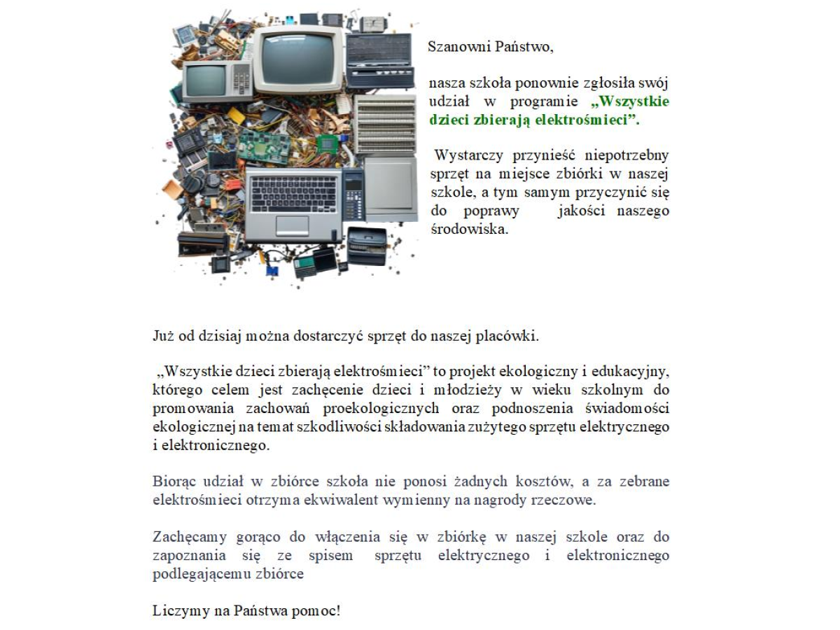 Szanowni Państwo, nasza szkoła ponownie zgłosiła swój udział w programie „Wszystkie dzieci zbierają elektrośmieci”.